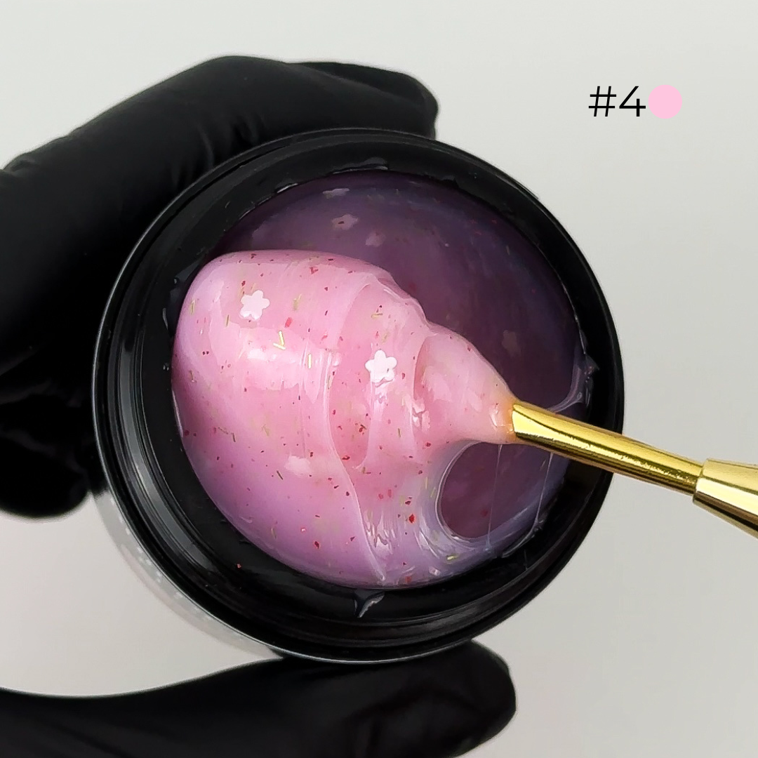 Builder gel Flower - Ingredients: Acrylates Copolymer, (2,2-Dimethyl-1,3-dioxolan-4-yl)methyl prop-2-enoate, Silica dimethyl silylate, Polyethylene terephthalate, TrimethylbenzoylDitolylphosphine Oxide, PPG-2 Neopentyl Glycol Diacrylate, +/-: CI 77891, CI 18965,CI 15510, CI 73360, CI 73385, CI 74160, CI 74260, CI 77266